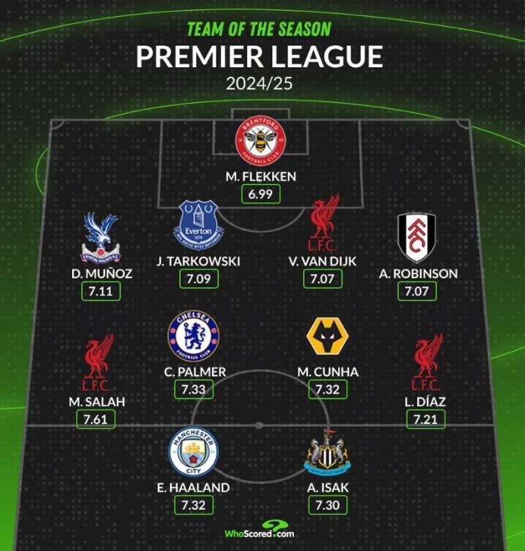 Whoscored评本赛季英超最佳阵:萨拉赫领衔,哈兰德、帕尔默在列