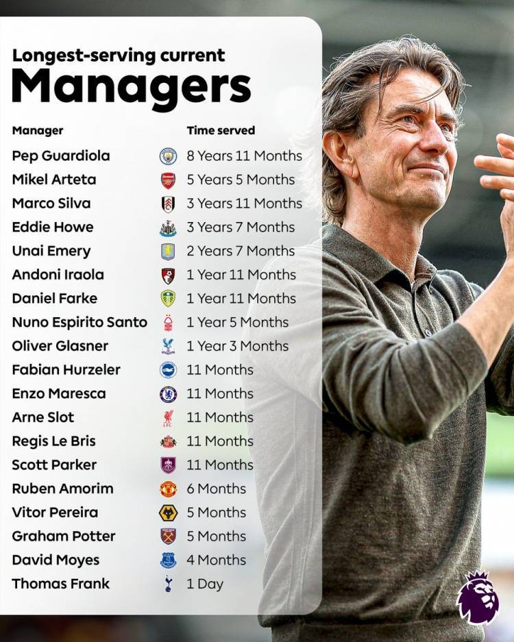 据英超官方统计,瓜迪奥拉是当前执教时间最长的主帅,阿尔特塔次席,马尔科-席尔瓦第三。