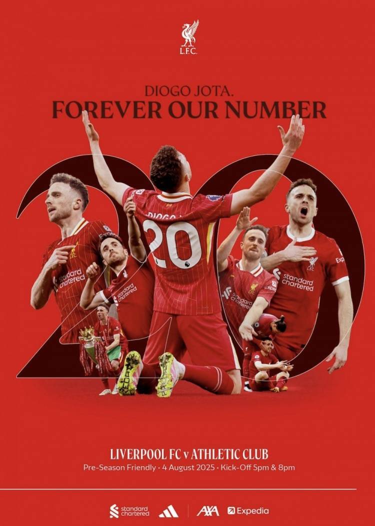 在2025-26赛季安菲尔德首场比赛日的特刊封面上,特别向若塔致敬!他是永远的利物浦20号球员。