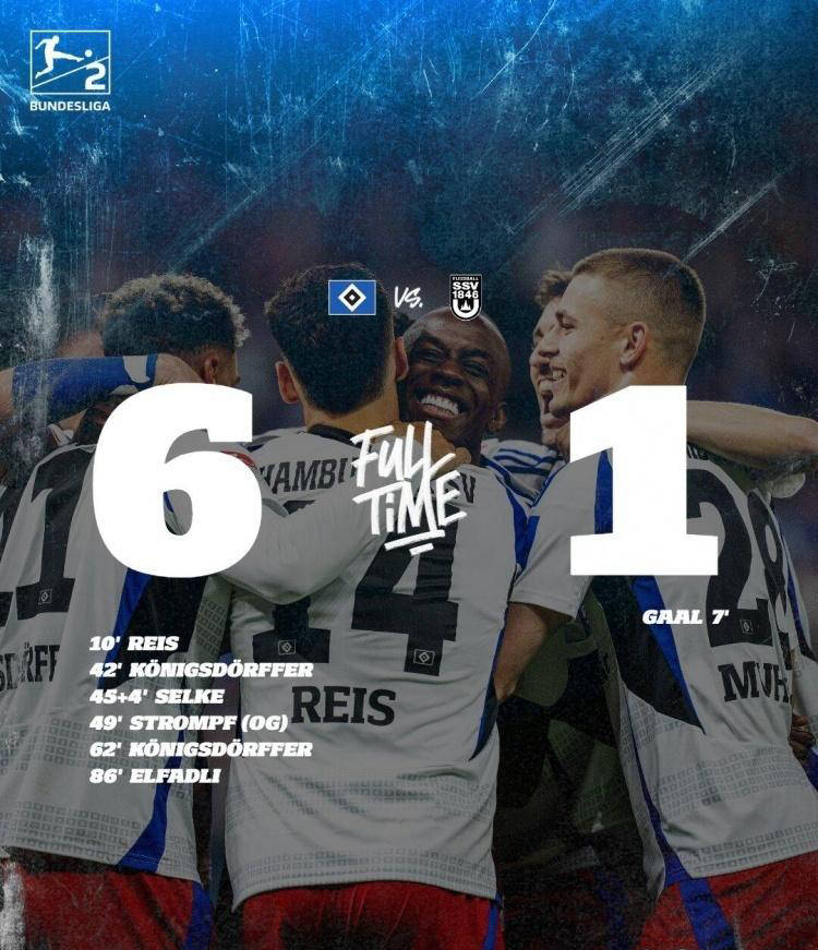 下半场刚开始不到10分钟,东佩再次助攻,施特龙普夫误碰自家球门,使得汉堡将比分差距扩大到4-1,为比赛奠定了坚实的基础。之后,柯尼希斯多费尔展现了个人技术,在62分钟用一记低射得分,将比分锁定在5-1。比赛末段,东佩再次贡献助攻,埃尔法德利门前抢点得手,最终汉堡以6-1的巨大优势完胜乌尔姆。
