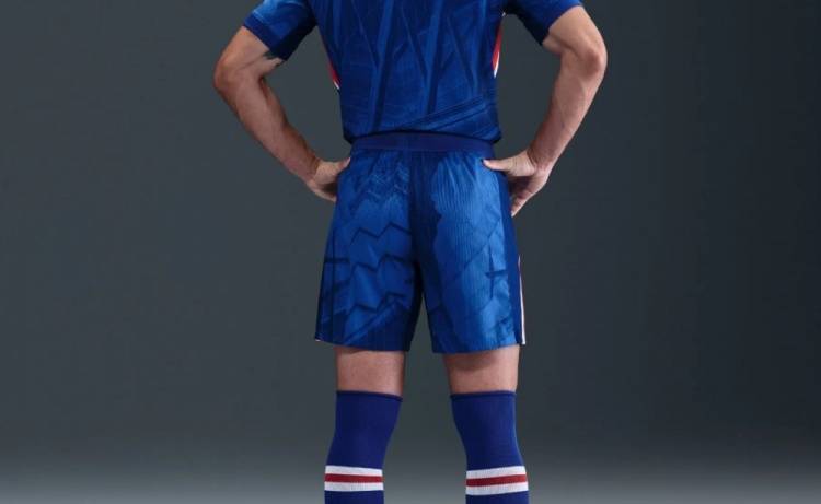 主场球衣:球衣采用俱乐部传统蓝色设计,整体印有不规则图形和图案装饰,领口(镶嵌白色)和袖口均为深蓝色